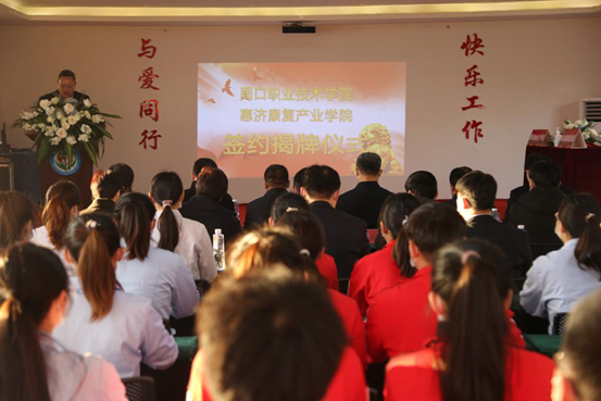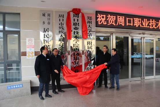 周口市副市长秦胜军,周口市政协副主席李应权,校党委书记刘士欣,周口惠济康复医院董事长、院长王希振共同为产业学院揭牌。