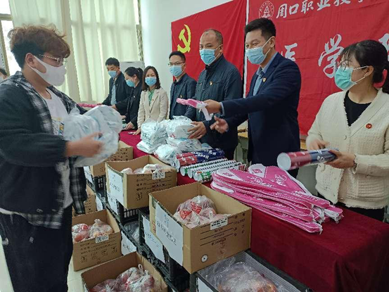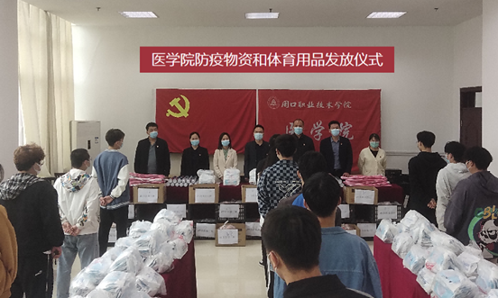 为进一步加强学生疫情防控教育,提高学生强身健体意识,守牢疫情防控底线,5月11日,周口职业技术学院医学院为同学们发放防疫物资与体育用品。