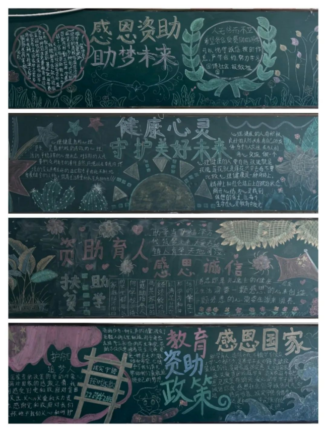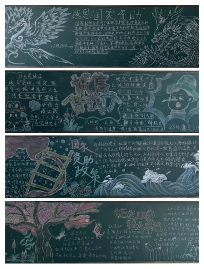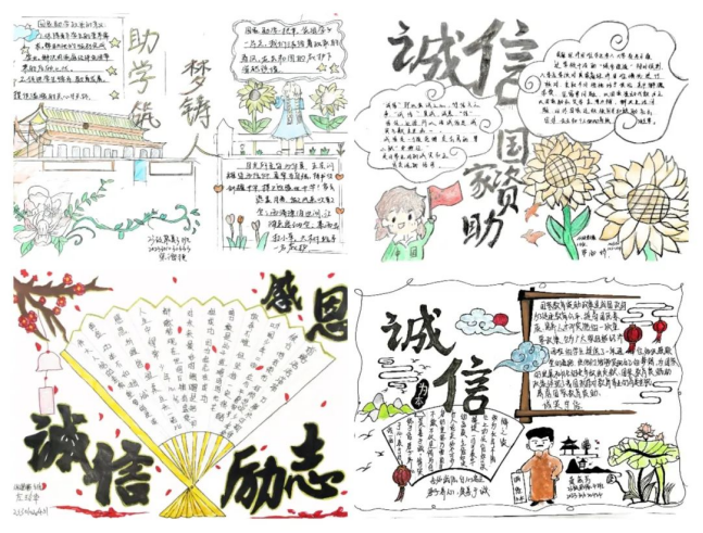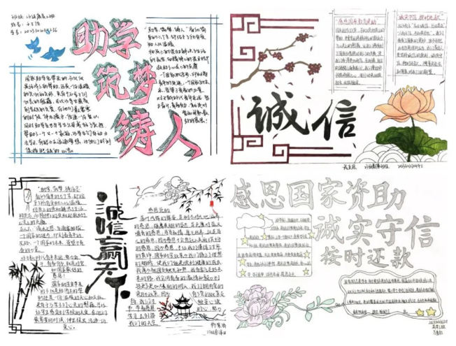 资助育人,诚信为本。此次“感恩国家教育资助,诚实守信,按时还款”主题手抄报及黑板报活动,让国家资助政策跃然于画面中,生动形象地展现出资助政策的魅力和光辉,增强了我院学生诚信受助的意识,同时,也表达了我院受资助学子对国家资助政策的感恩之情与励志成才之心,充分发挥了资助育人的双重成效。相信受到资助的同学们必将乘着国家资助政策的春风,筑梦圆梦,竞相绽放青春的花朵。
