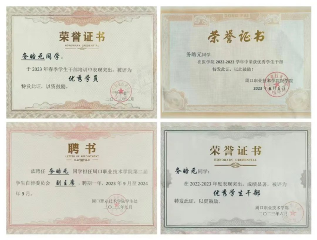 务皓元,22级康复治疗技术专业学生,现担任学生自律委员会主席,学习优秀,获得校内奖学金,省级文明学生,省级优秀学生干部。校级“优秀学生干部”“文明学生”的称号。他积极的组织和参与校园内的各项活动,表现出了良好的组织能力和团队精神。并且在迎新活动和运动会中荣获“优秀志愿者”,他的经历不仅丰富了他的日常生活,同时也加强了他的责任感和奉献精神。