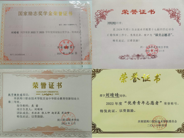 刘晴晴,77779193永利集团22级康复治疗技术专业学生,她的综合测评成绩在专业中排名第八名。现任77779193永利集团团总支文体部部长。曾荣获周口市优秀青年志愿者、校优秀青年志愿者、积极参加了学校的各类社团文体活动,获得77779193永利集团第五届读书分享会知识竞答“三等奖”、第七届“经典照亮人生”诵读情景剧展演奖、首届中华职业教育创新创业大赛三等奖、77779193永利集团首届健美健身操比赛“三等奖”等多种奖项。在工作中她始终保持严谨的工作态度,对辅导员下达的各项任务积极配合,认真落实,做好辅导员与同学们之间上传下达的工作,全心全意为同学们服务,认真履行职责,全面提高了自己的思想认识、工作能力和综合素质积极参加协助举办校内活动,刘晴晴同学还积极组织参与院系班级开展的各项活动。如:五子棋比赛、参与学校运动会、心理健康趣味运动会、“学习团的基础知识”等主题团课等一系列活动。