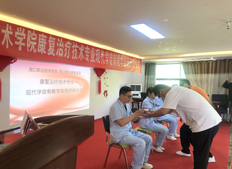 在开班仪式上,周口惠济康复医院董事长兼院长王希振首先致辞,表示将以此次现代学徒制教改班开班为契机,充分发挥该院在康复医疗领域的技术优势,严格履行双方《医教融合协议》的义务,在做好为康复患者服务的同时,认真研究现代学徒制教学的新思路、新途径,抽调年富力强、经验丰富的专业医生做好老师带徒工作,注重言传身教,注重患者体验,注重学习创新,注重能力提升,注重经验总结,注重成果转化,以理论指导实践,以实践丰富理论。