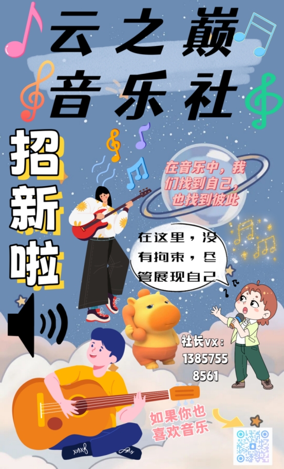 如果你对音乐有着热爱和追求,那么请不要犹豫,加入我们的云之巅音乐社,让我们一起创造美妙的音乐之旅。