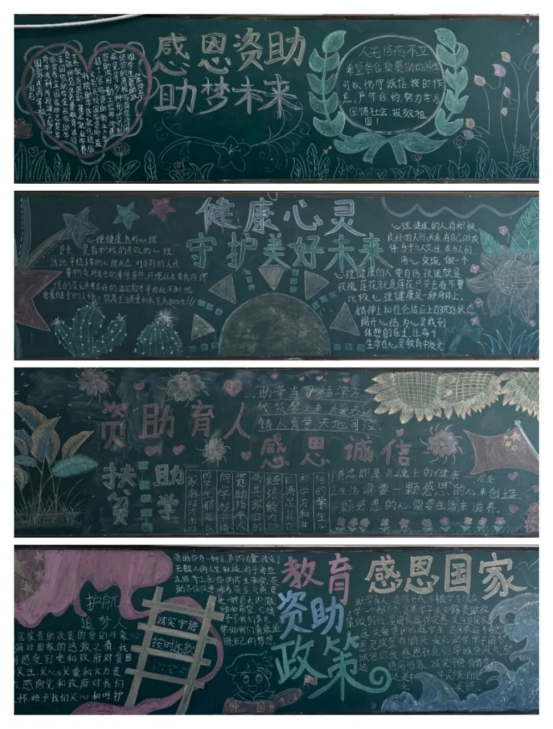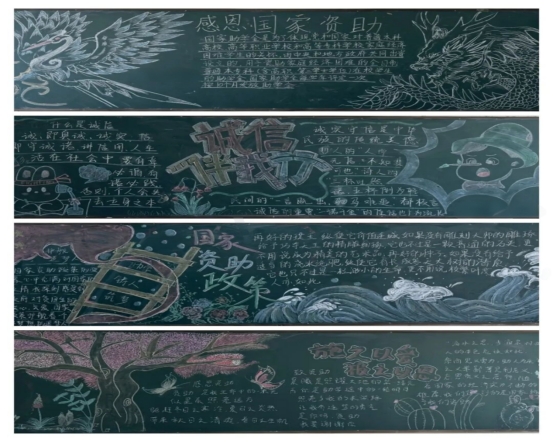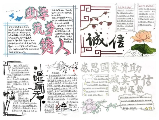 资助育人,诚信为本。此次“感恩国家教育资助,诚实守信,按时还款”主题手抄报及黑板报活动,让国家资助政策跃然于画面中,生动形象地展现出资助政策的魅力和光辉,增强了我院学生诚信受助的意识,同时,也表达了我院受资助学子对国家资助政策的感恩之情与励志成才之心,充分发挥了资助育人的双重成效。相信受到资助的同学们必将乘着国家资助政策的春风,筑梦圆梦,竞相绽放青春的花朵。